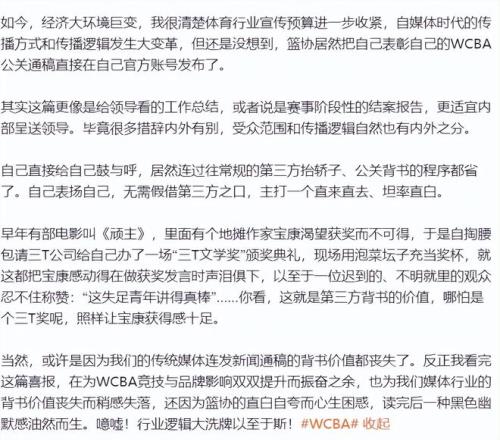 知名篮球媒体人付政浩表示:“这种明显带有自夸性质的公关稿件不应是由第三方来发布才更有背书效果和公信力吗?现在都习惯直接‘王婆卖瓜自卖自夸’吗?”